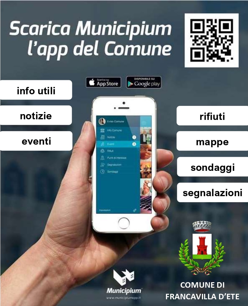 Si comunica che è scaricabile gratuitamente dagli appositi store la APP Municipium per smartphone e dispositivi mobili in genere, adottata in via ufficiale dal Comune di Francavilla d'Ete per consentire ai cittadini di rimanere sempre aggiornati sull’operato dell’Amministrazione e dei singoli Uffici, nonché sulle informazioni riguardanti tutta la comunità.