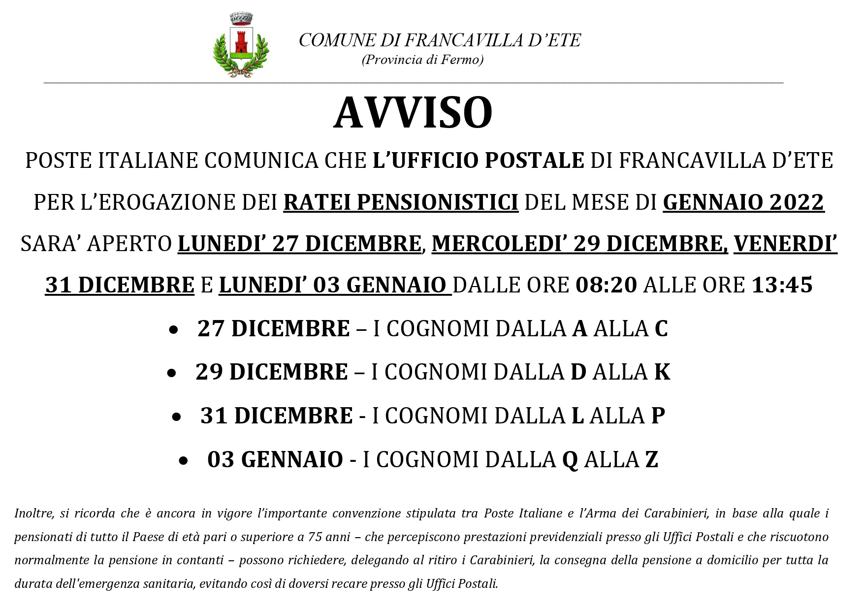 APERTURA UFFICIO POSTALE DI FRANCAVILLA D'ETE - EROGAZIONE RATEI PENSIONISTICI MESE DI GENNAIO 2022