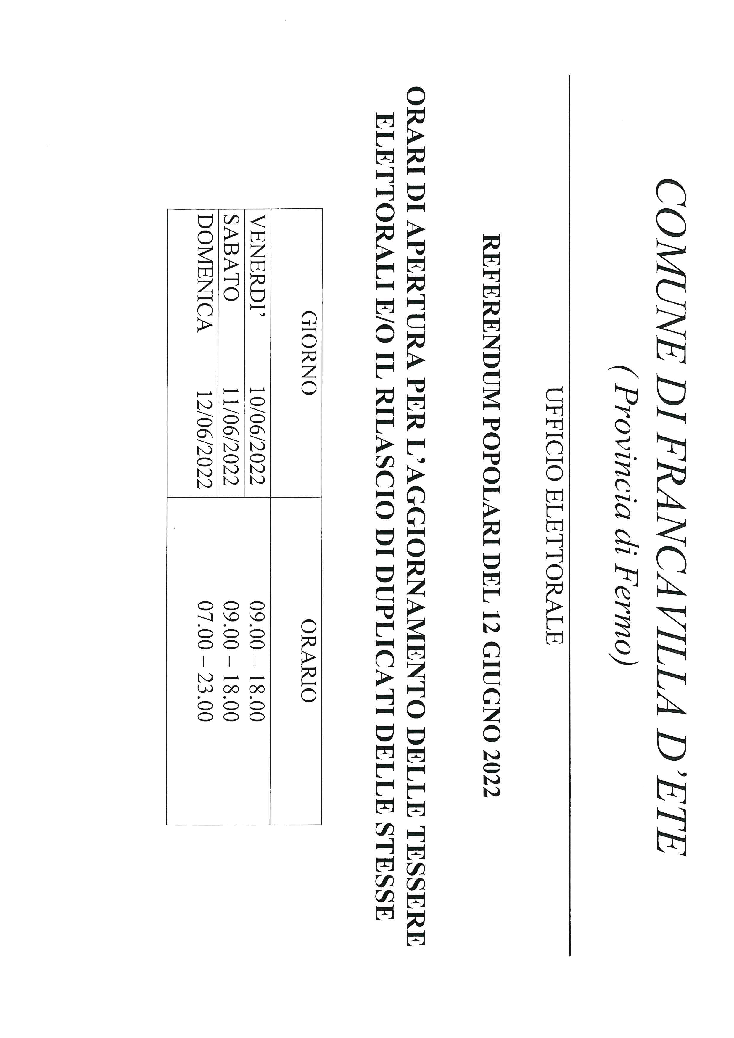 ORARI DI APERTURA PER L'AGGIORNAMENTO DELLE TESSERE ELETTORALI E/O IL RILASCIO DI DUPLICATI DELLE STESSE