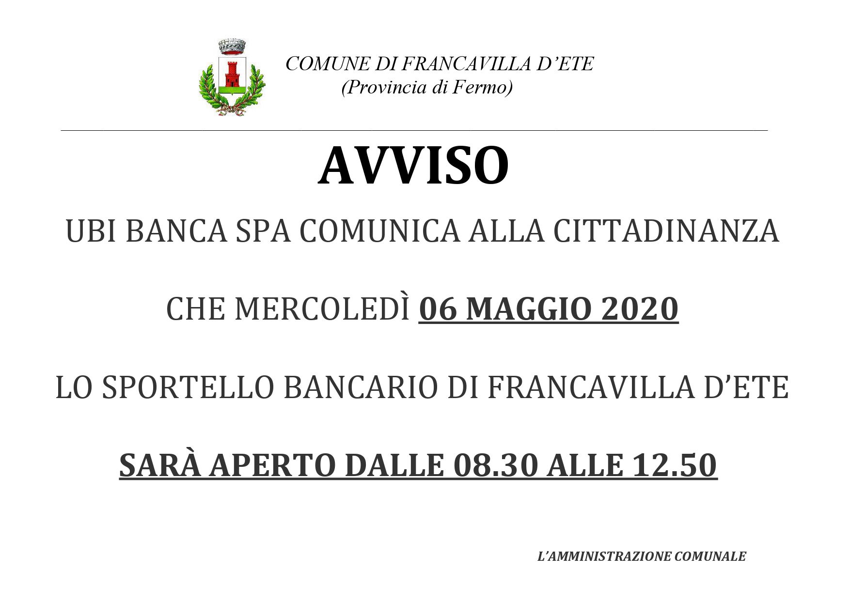 APERTURA SPORTELLO BANCARIO DI FRANCAVILLA D'ETE - MERCOLEDI' 06/05/2020