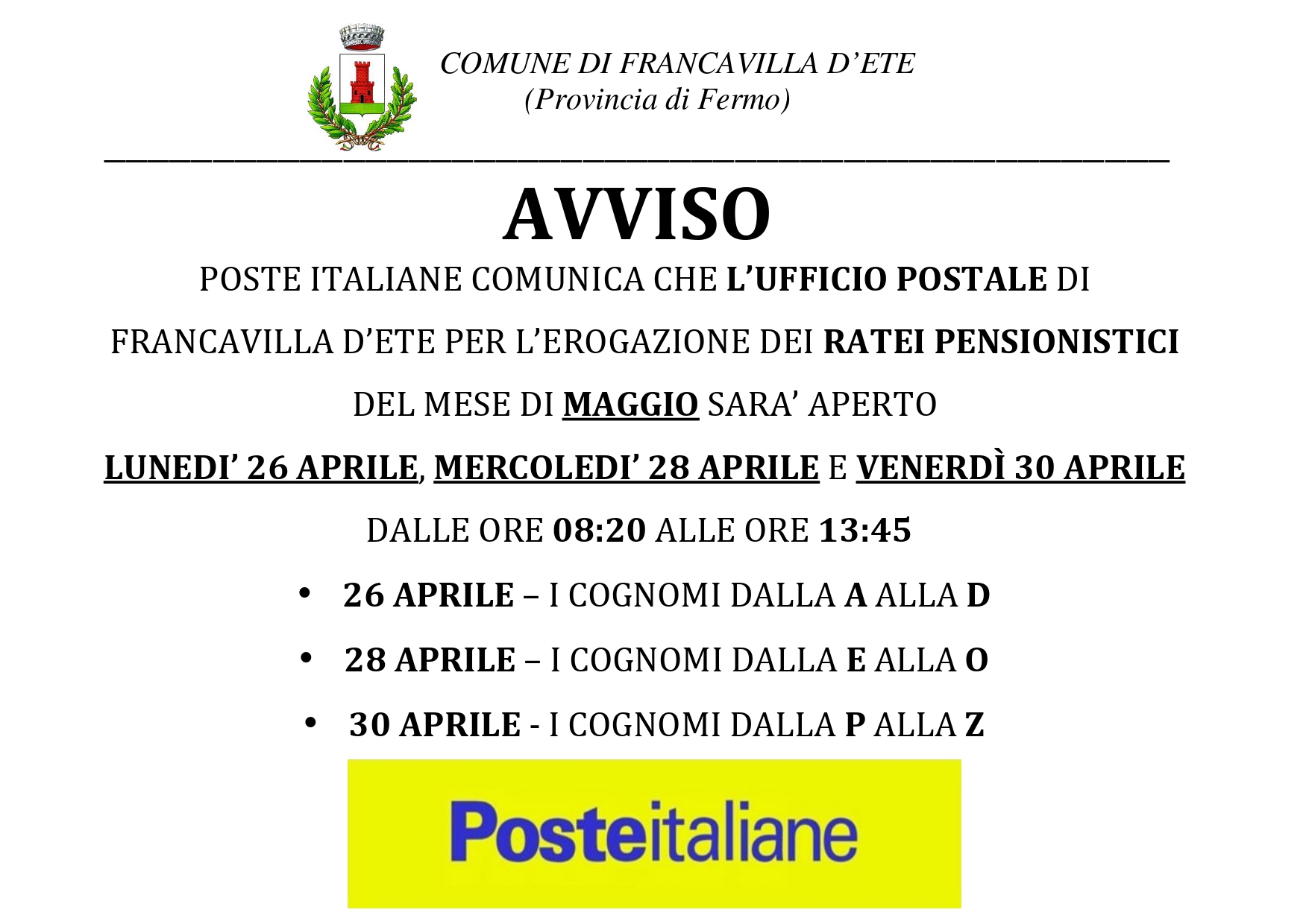 APERTURA UFFICIO POSTALE DI FRANCAVILLA D'ETE - EROGAZIONE RATEI PENSIONISTICI MESE DI MAGGIO