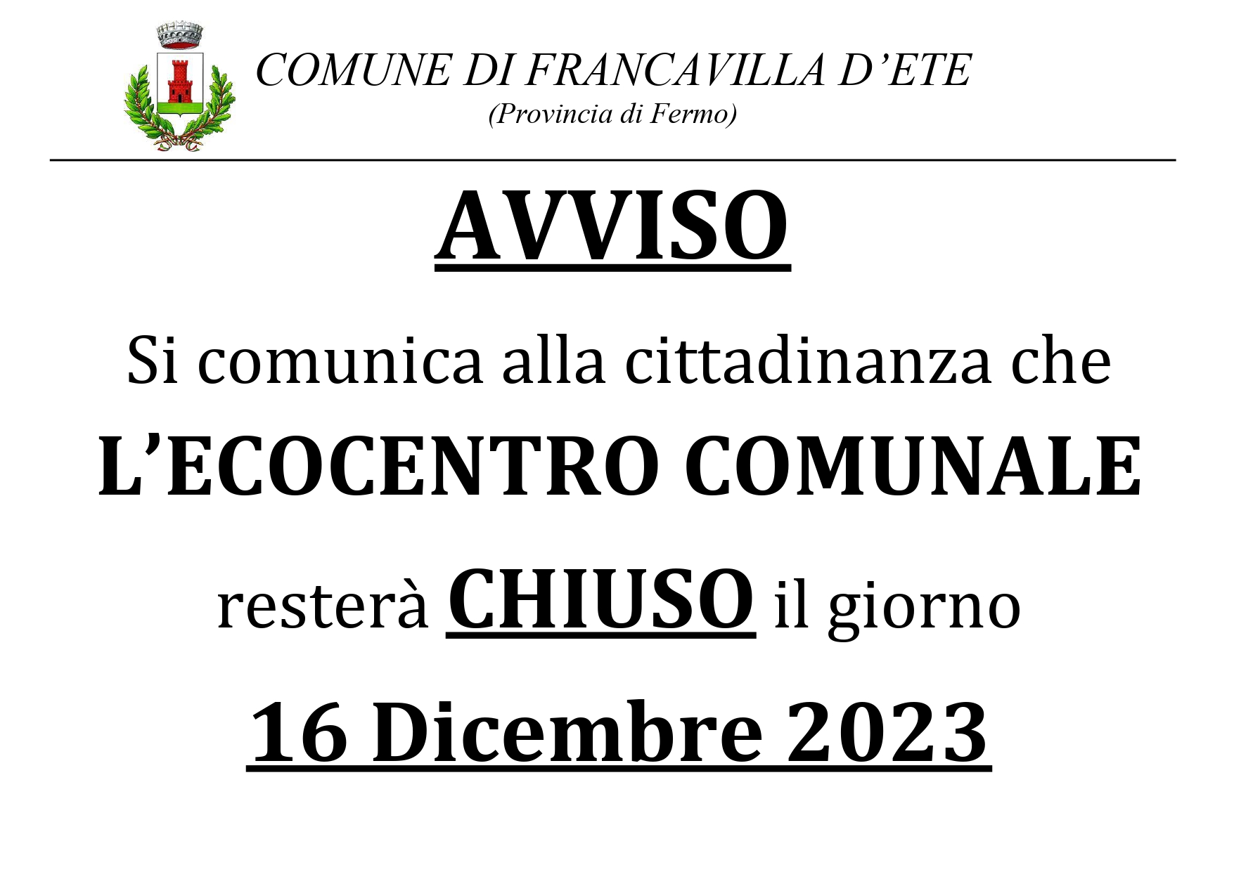 SABATO 16 DICEMBRE 2023 L'ECOCENTRO COMUNALE RESTERA' CHIUSO