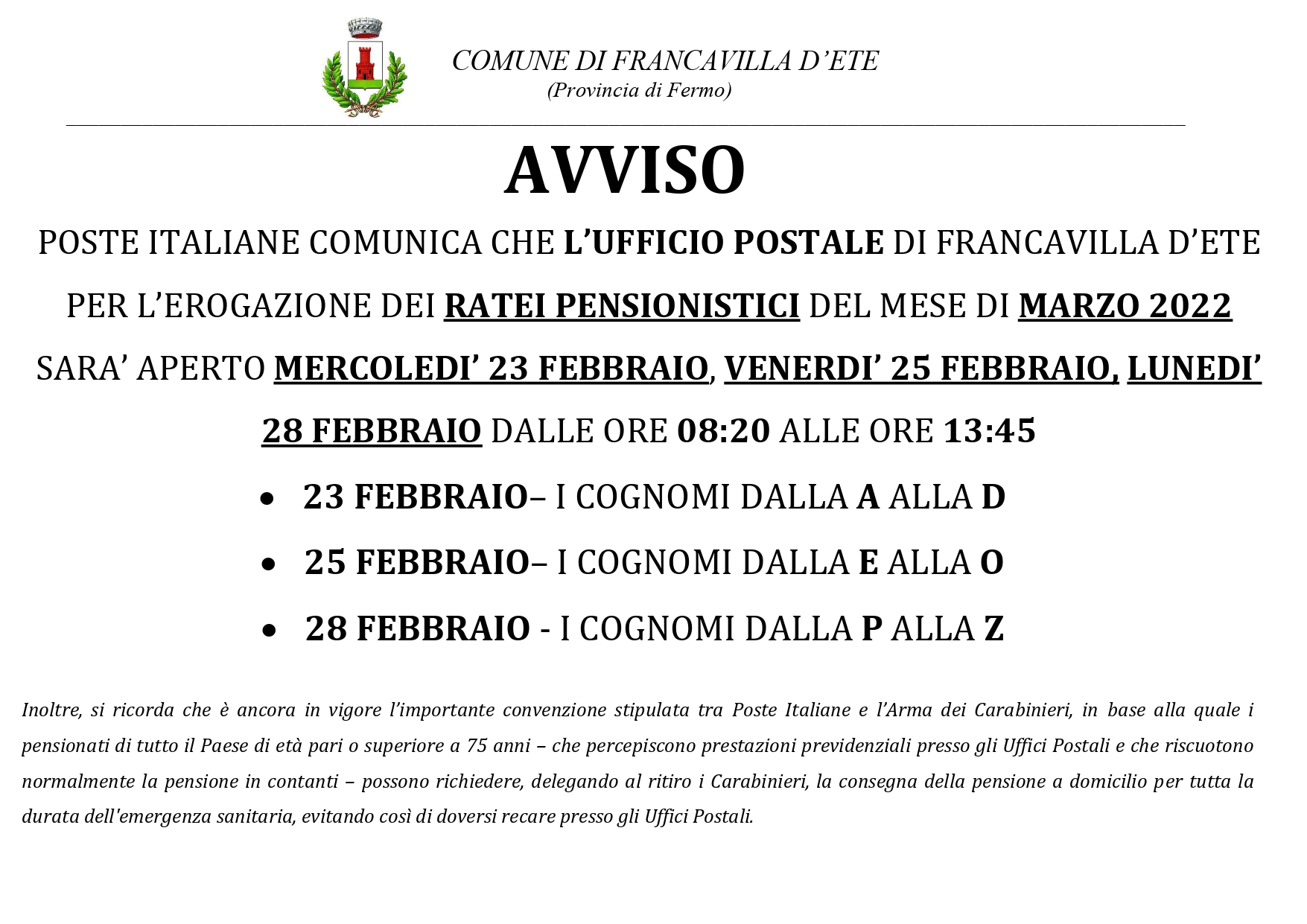 APERTURA UFFICIO POSTALE DI FRANCAVILLA D'ETE - EROGAZIONE RATEI PENSIONISTICI MESE DI MARZO 2022