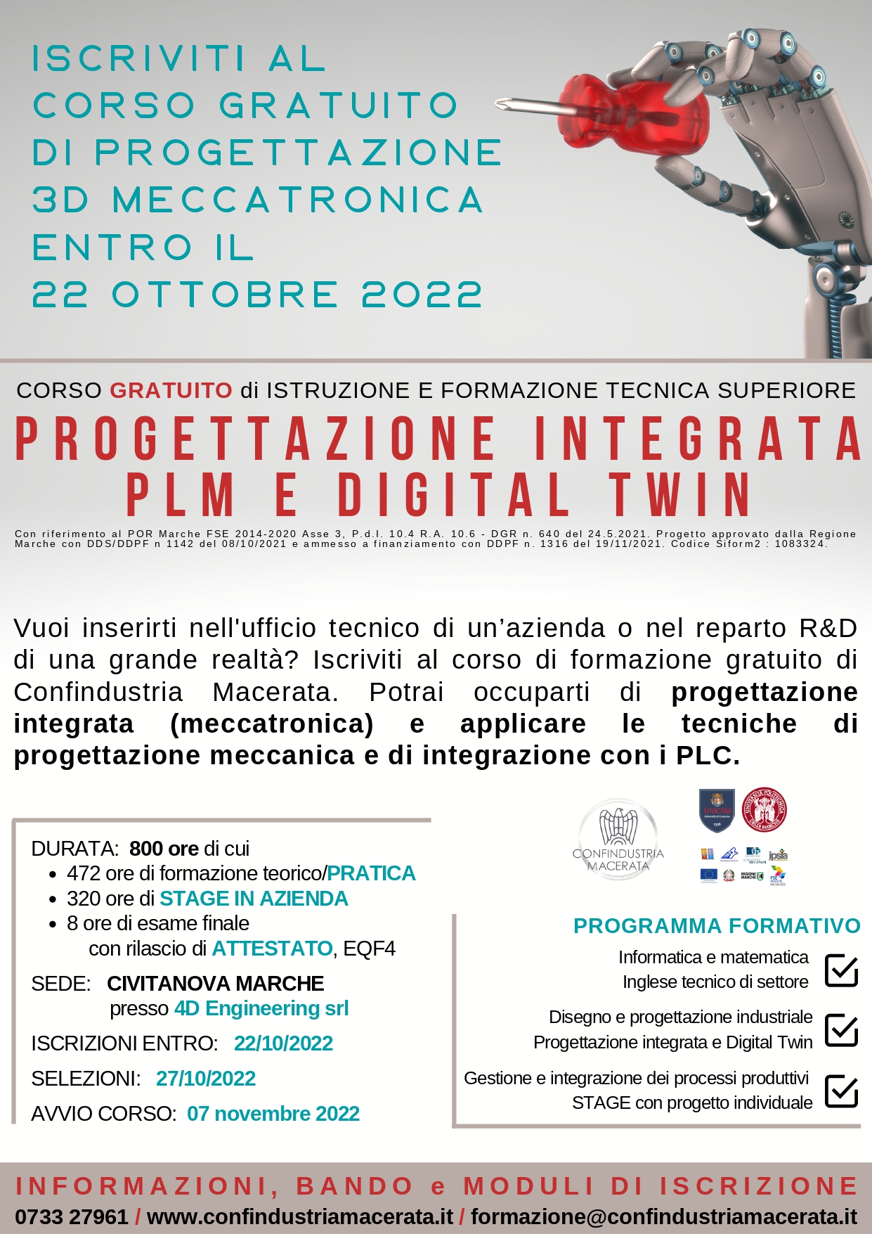 RIAPERTURA BANDO CORSO GRATUITO IFTS "TECNICO SUPERIORE PER LA PROGETTAZIONE INTEGRATA PLM E DIGITAL TWIN" - SCADENZA ISCRIZIONI 22/10/2022