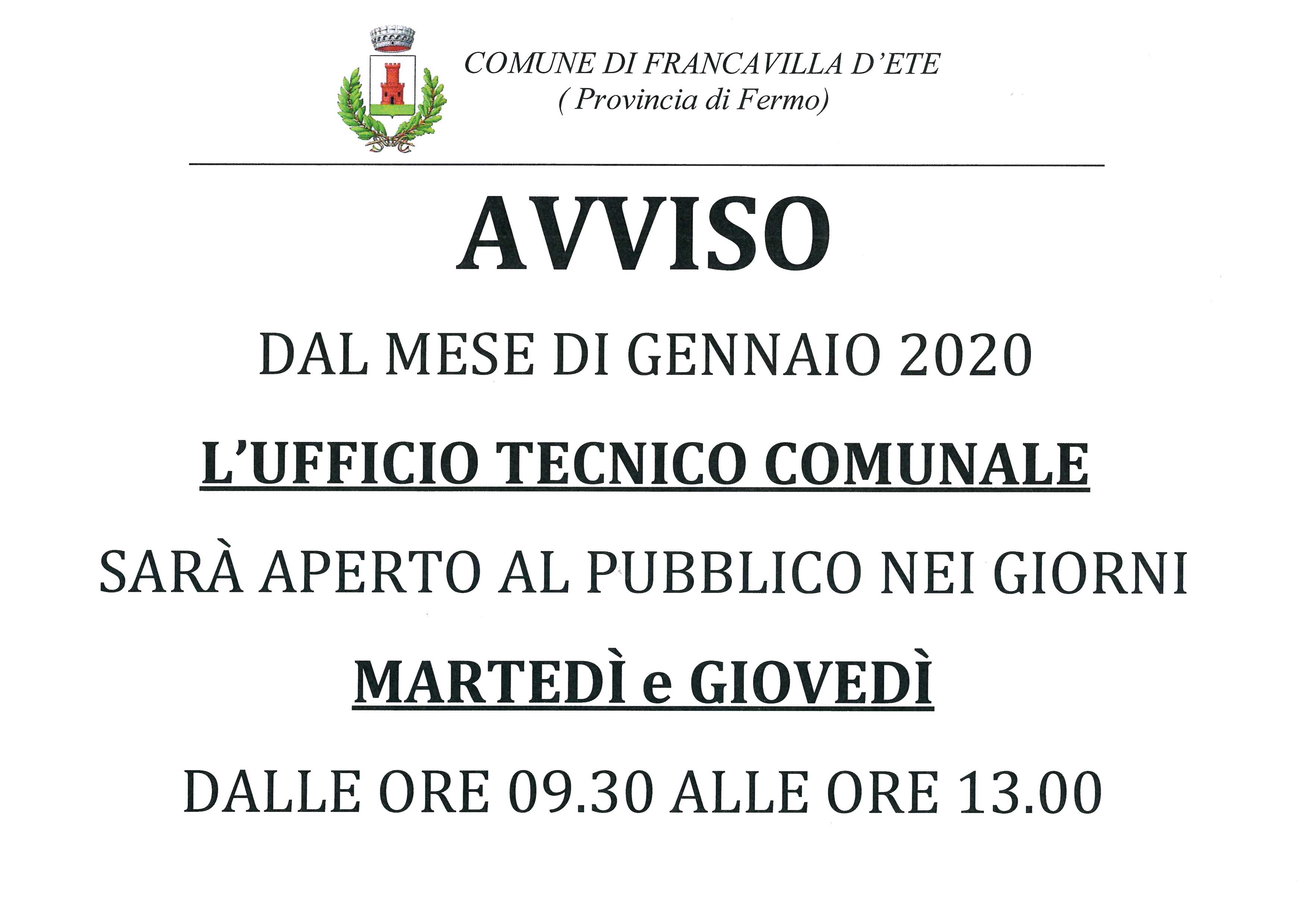 Dal mese di Gennaio 2020 L'UFFICIO TECNICO COMUNALE sarà aperto al pubblico nei giorni MARTEDì E GIOVEDì dalle ore 09.30 alle ore 13.00.