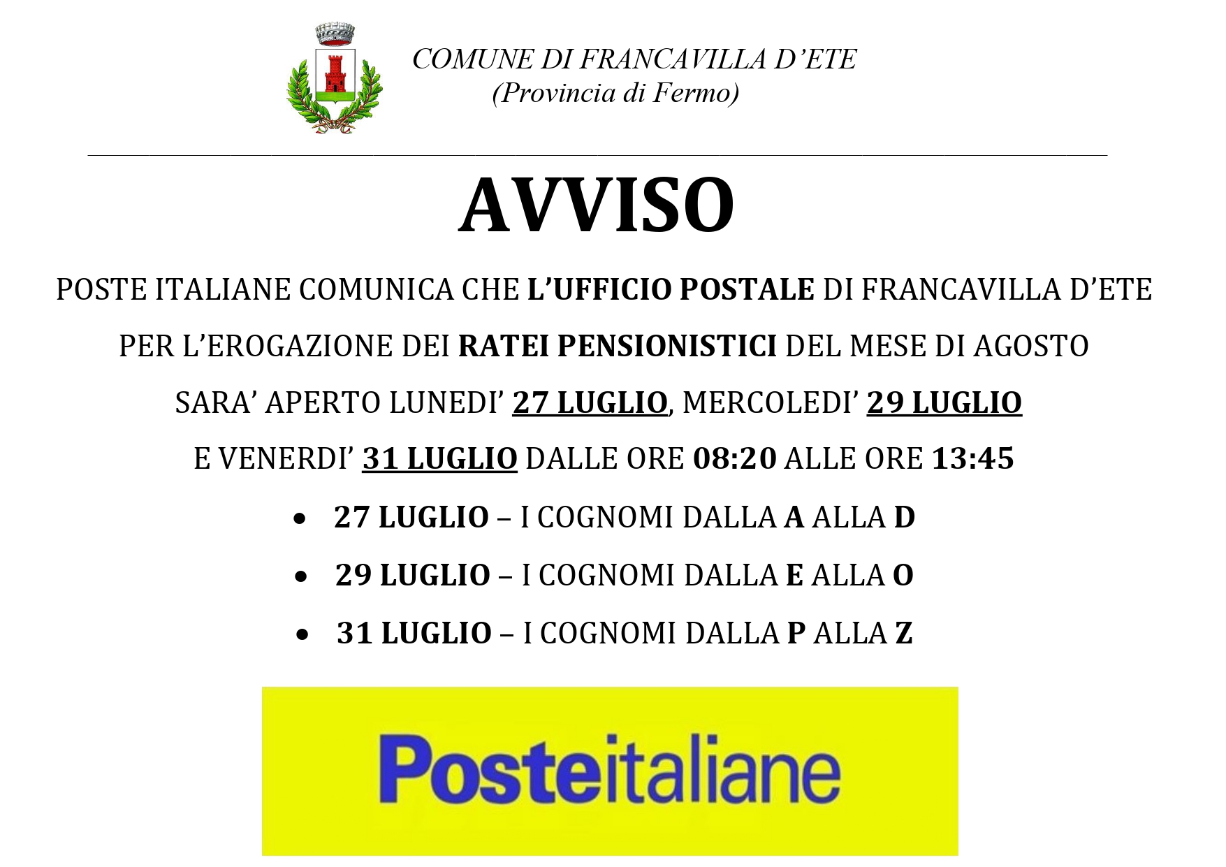 APERTURA UFFICIO POSTALE DI FRANCAVILLA D'ETE - EROGAZIONE RATEI PENSIONISTICI MESE DI AGOSTO