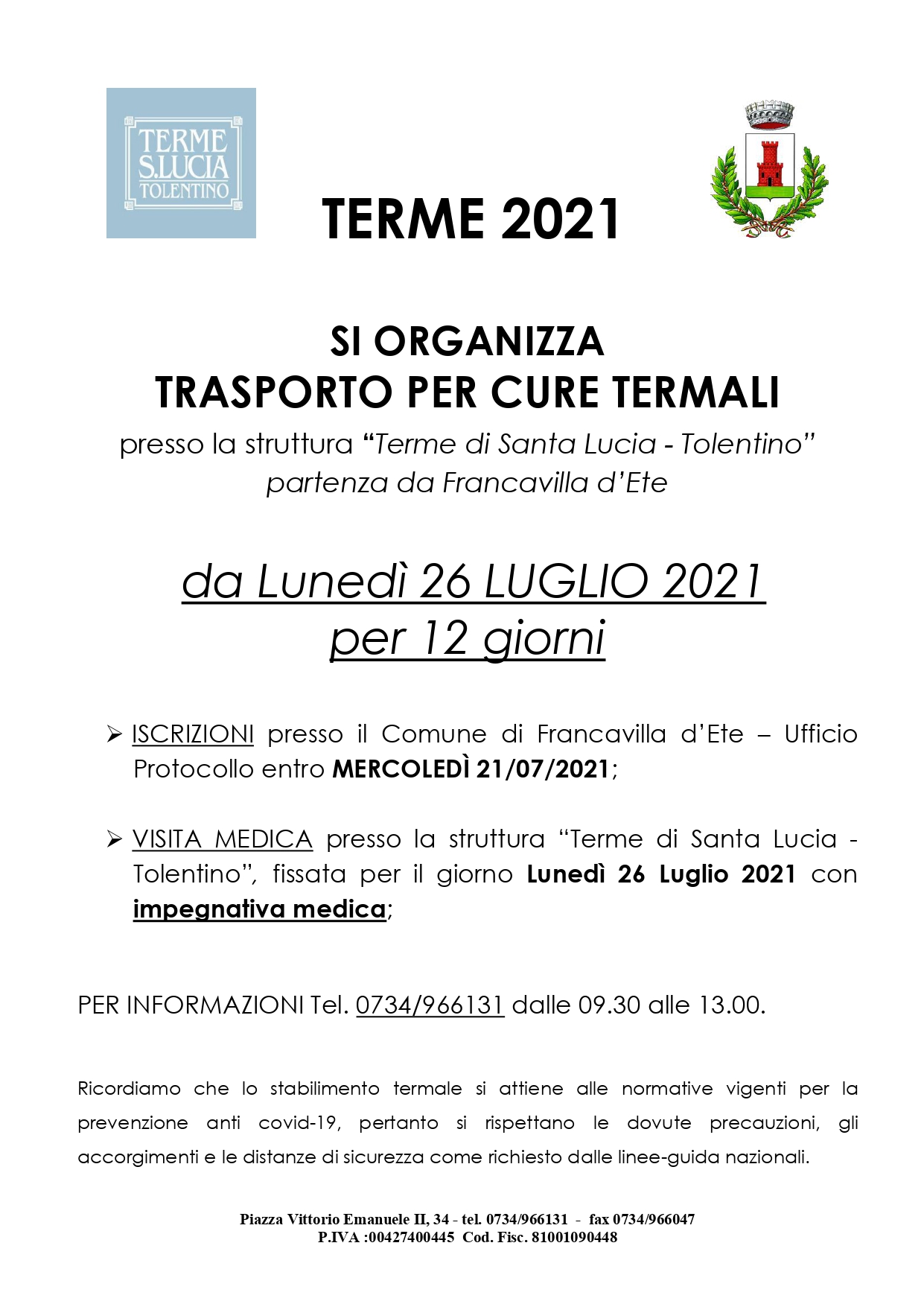 TRASPORTO PER CURE TERMALI presso la struttura “Terme di Santa Lucia - Tolentino”