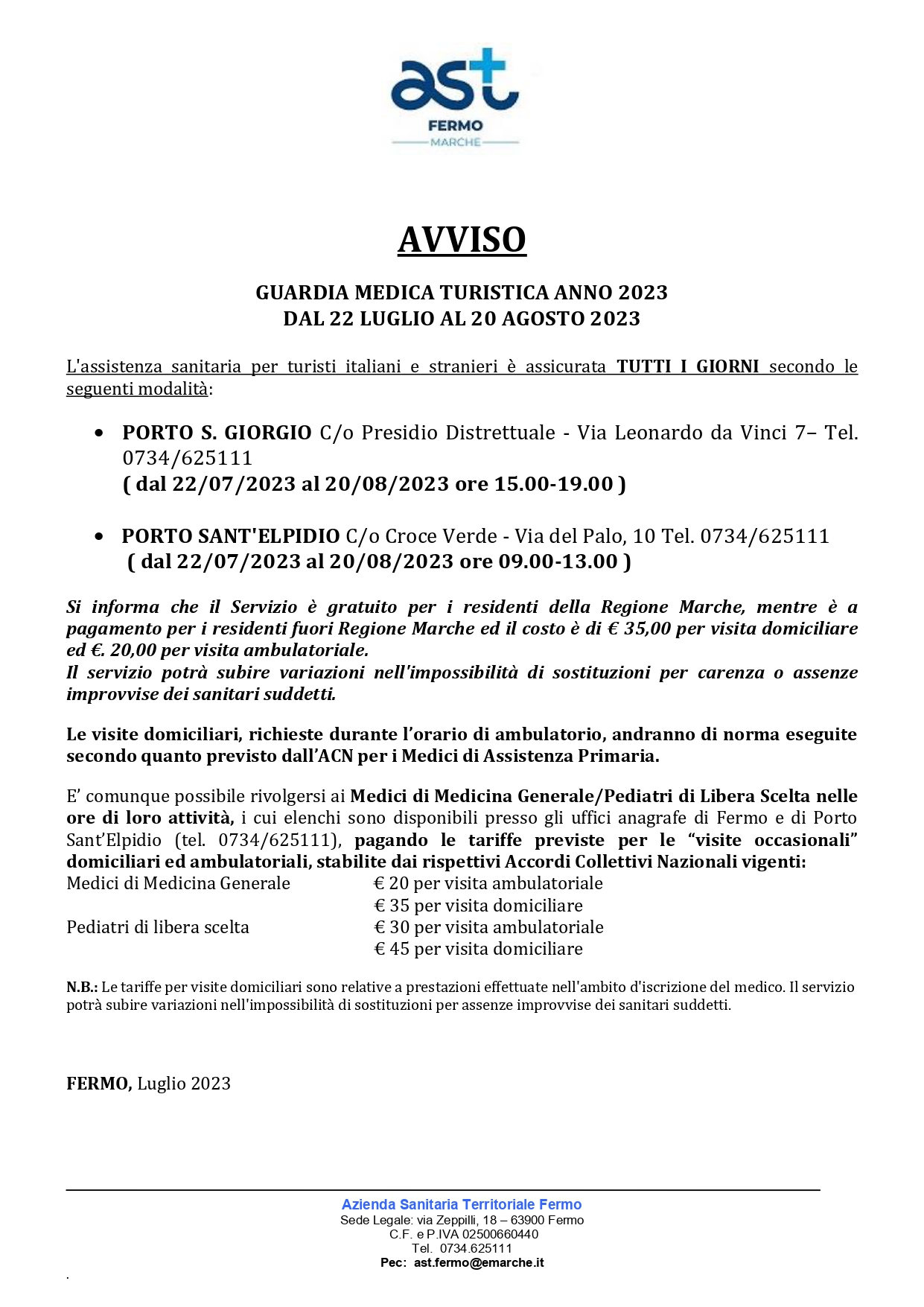 GUARDIA MEDICA TURISTICA ANNO 2023 - DAL 22 LUGLIO AL 20 AGOSTO 2023