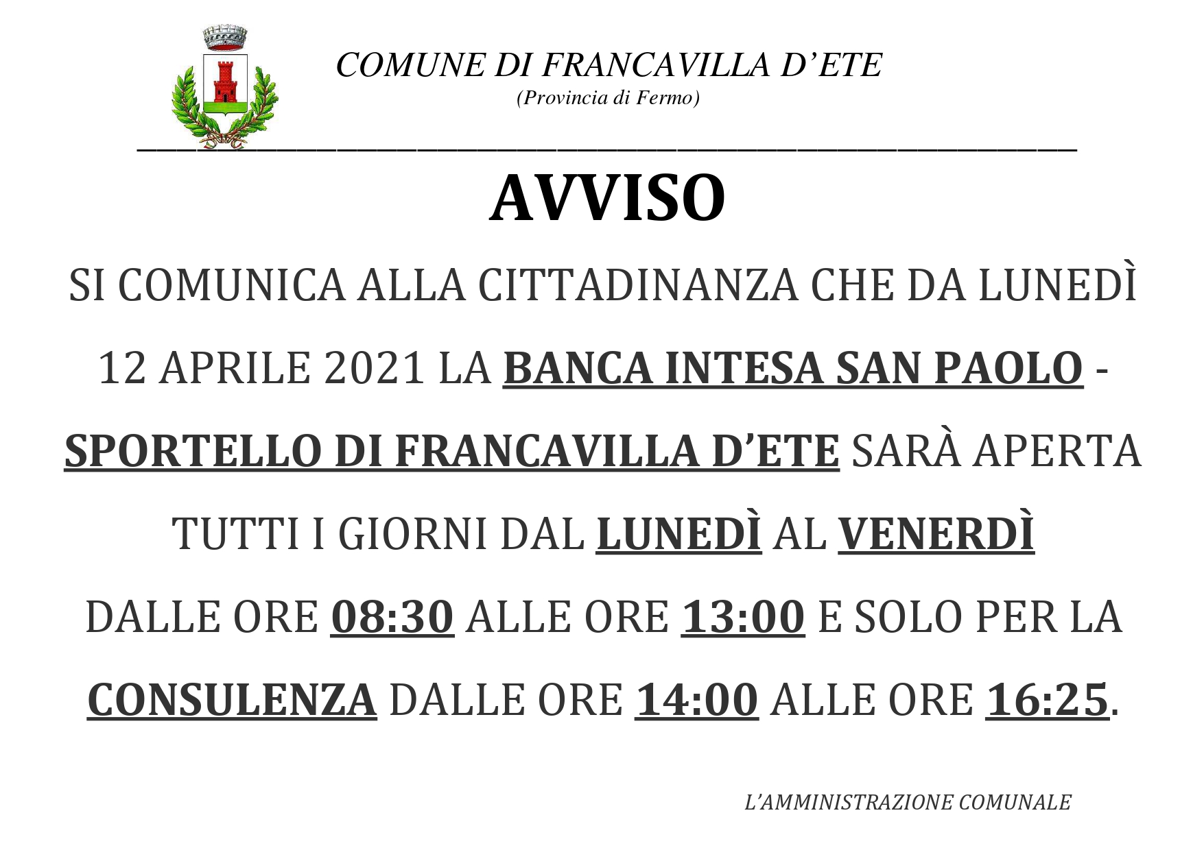GIORNI ED ORARI DI APERTURA BANCA INTESA SAN PAOLO - SPORTELLO DI FRANCAVILLA D'ETE