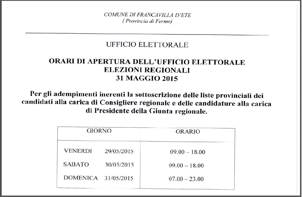 ORARI DI APERTURA DELL’UFFICIO ELETTORALE ELEZIONI REGIONALI 31 MAGGIO 2015