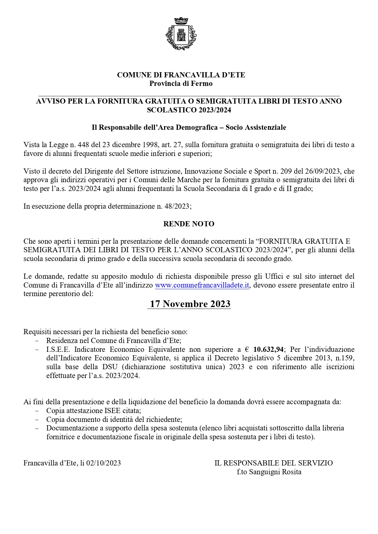 AVVISO PER LA FORNITURA GRATUITA O SEMIGRATUITA DI LIBRI DI TESTO PER GLI STUDENTI DELLA SCUOLA DELL'OBBLIGO E DELLA SCUOLA SECONDARIA SUPERIORE PER L' ANNO SCOLASTICO 2023/2024