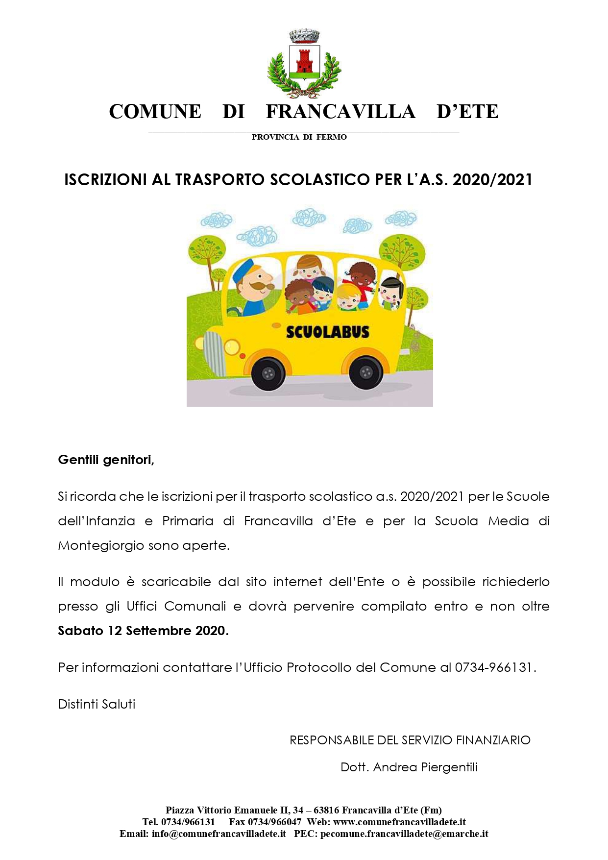 ISCRIZIONI APERTE PER IL TRASPORTO SCOLASTICO A.S. 2020/2021