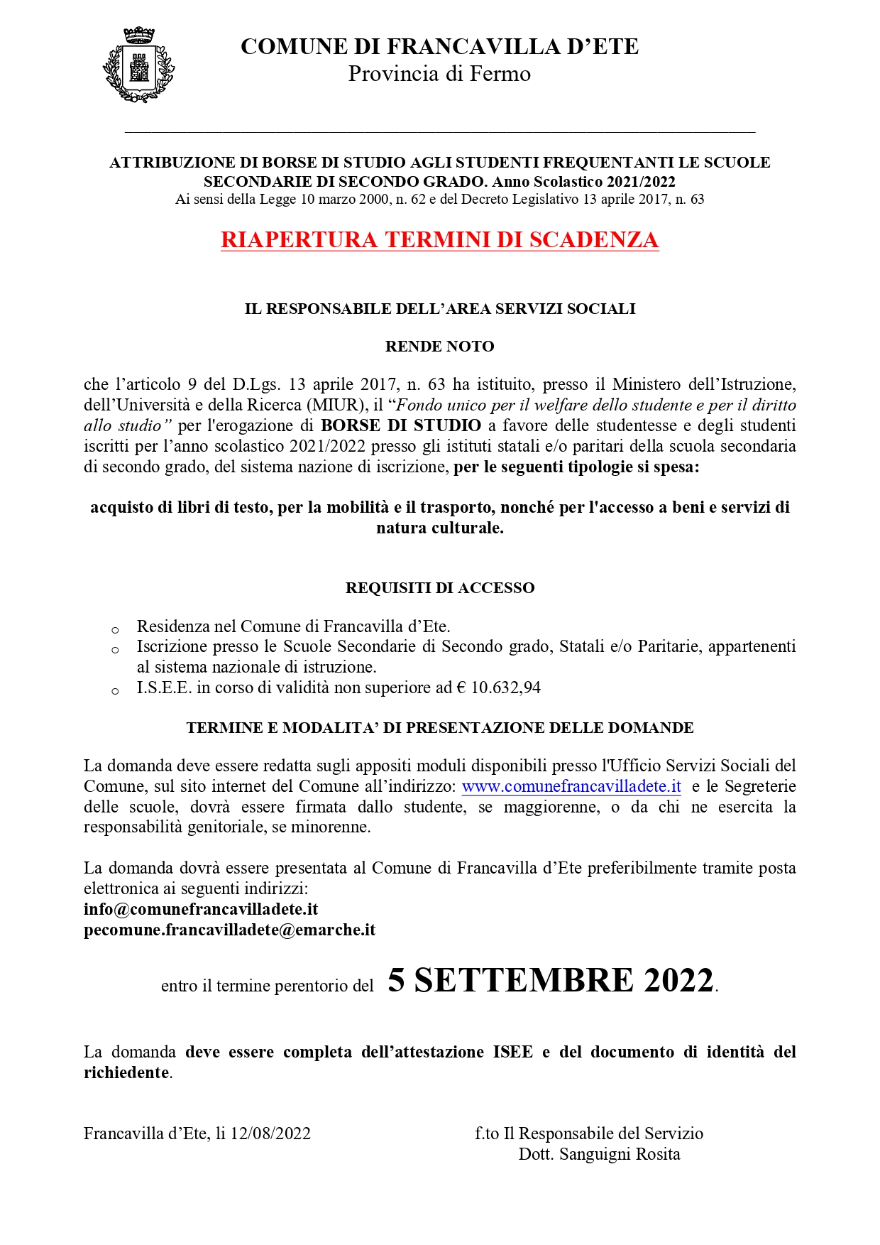 ATTRIBUZIONE DI BORSE DI STUDIO AGLI STUDENTI FREQUENTANTI LE SCUOLE SECONDARIE DI SECONDO GRADO. Anno Scolastico 2021/2022. RIAPERTURA TERMINI DI SCADENZA