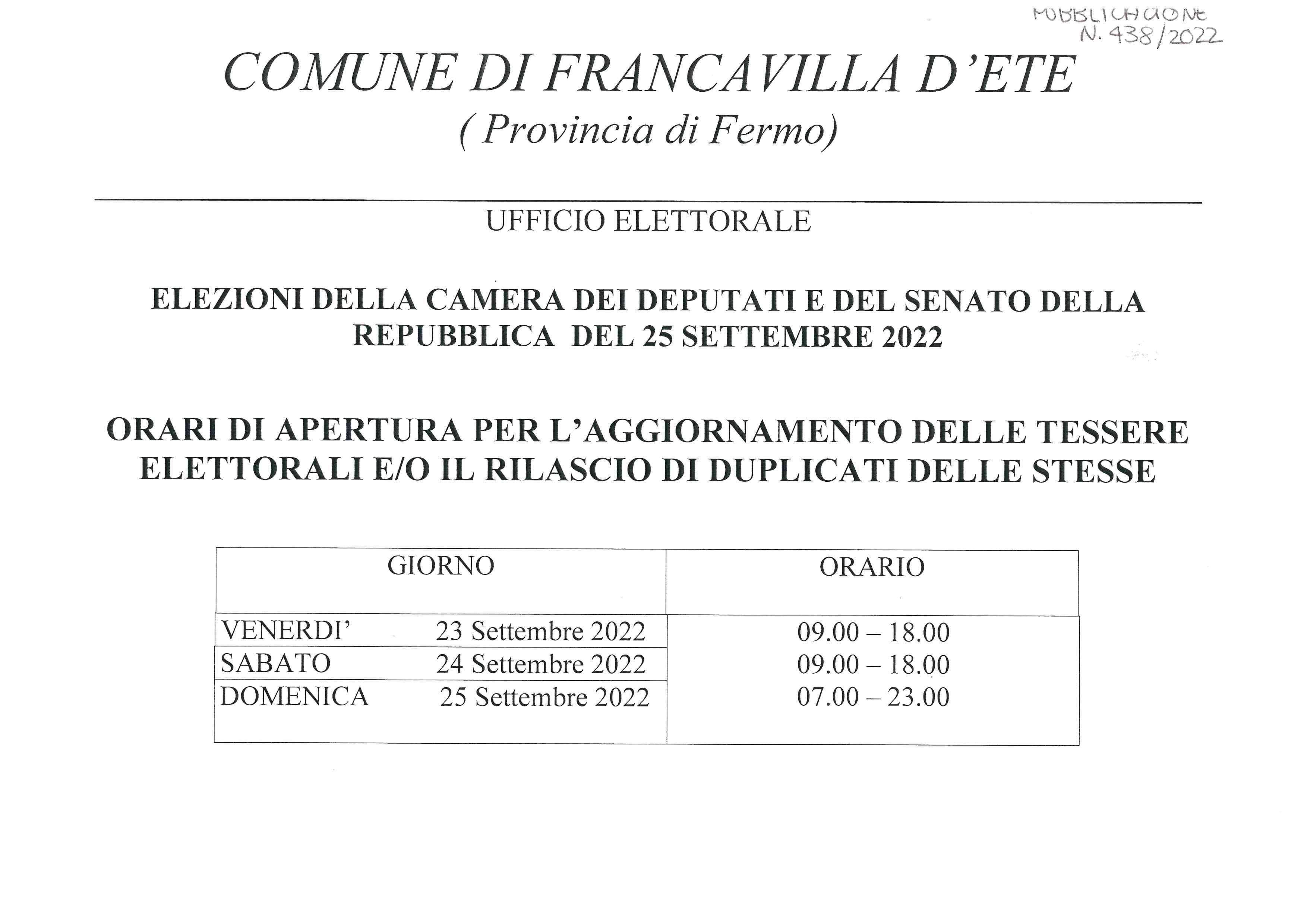 ELEZIONI POLITICHE 25 SETTEMBRE 2022 - ORARI DI APERTURA PER L'AGGIORNAMENTO DELLE TESSERE ELETTORALI E/O IL RILASCIO DI DUPLICATI DELLE STESSE.