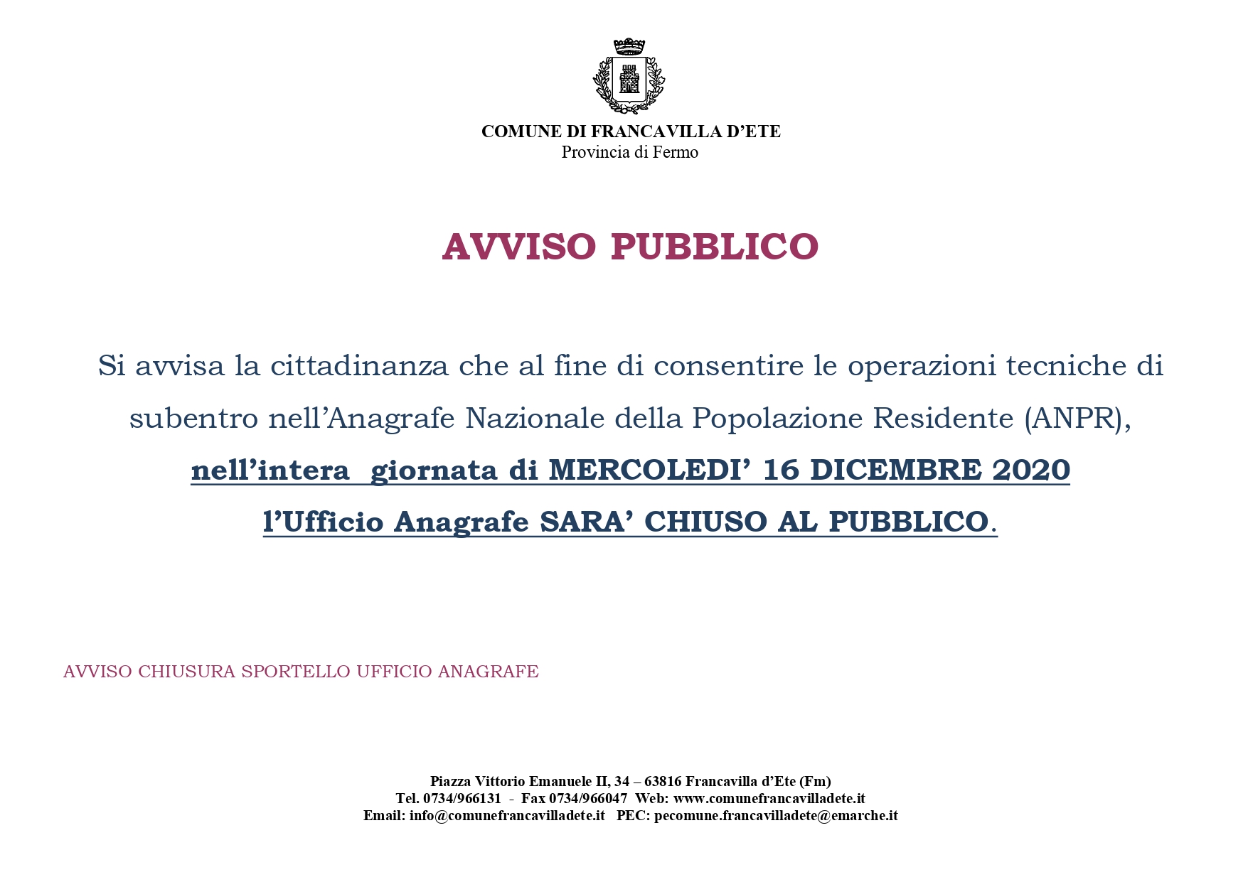 AVVISO CHIUSURA UFFICIO ANAGRAFE PER IL GIORNO 16 DICEMBRE 2020