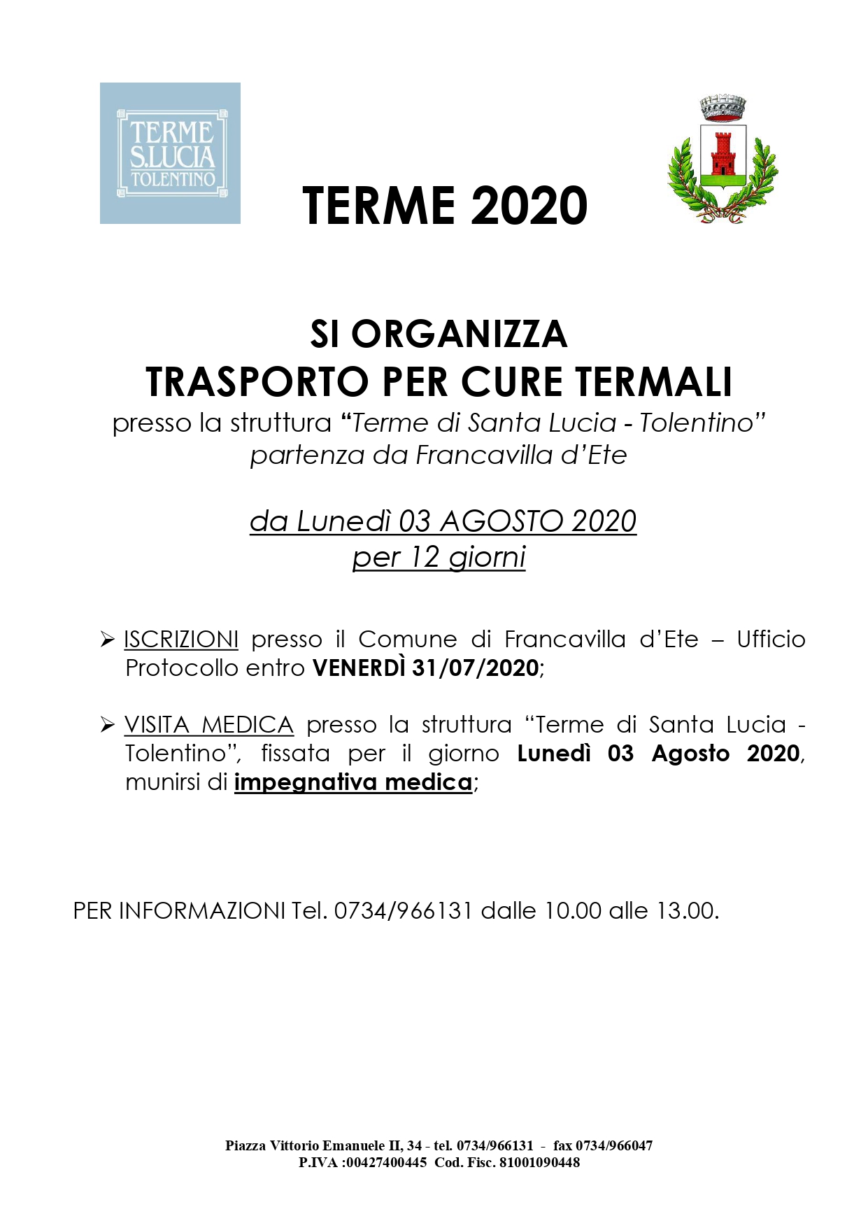 TRASPORTO PER CURE TERMALI PRESSO LA STRUTTURA "TERME DI SANTA LUCIA - TOLENTINO" DAL 03 AGOSTO 2020 PER 12 GIORNI