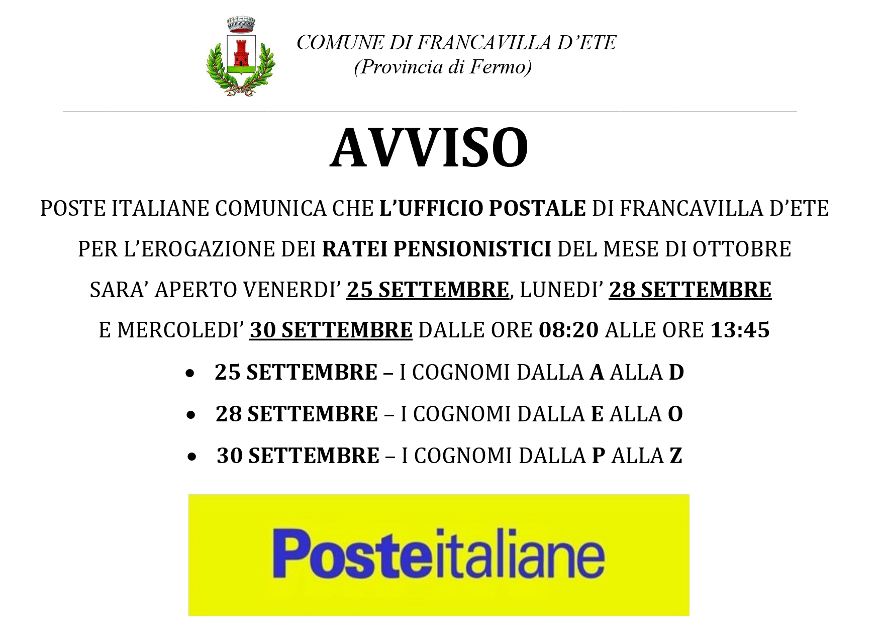 APERTURA UFFICIO POSTALE DI FRANCAVILLA D'ETE - EROGAZIONE RATEI PENSIONISTICI MESE DI OTTOBRE