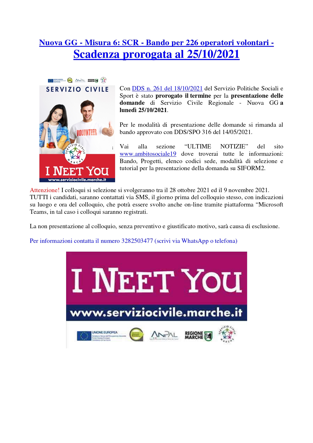 BANDO DI SELEZIONE per i progetti di SERVIZIO CIVILE REGIONALE - GARANZIA GIOVANI 2021 - PROROGA SCADENZA