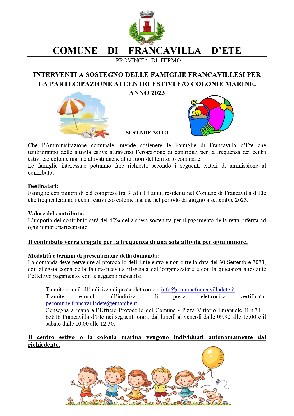 INTERVENTI A SOSTEGNO DELLE FAMIGLIE FRANCAVILLESI PER LA PARTECIPAZIONE AI CENTRI ESTIVI E/O COLONIE MARINE. ANNO 2023
