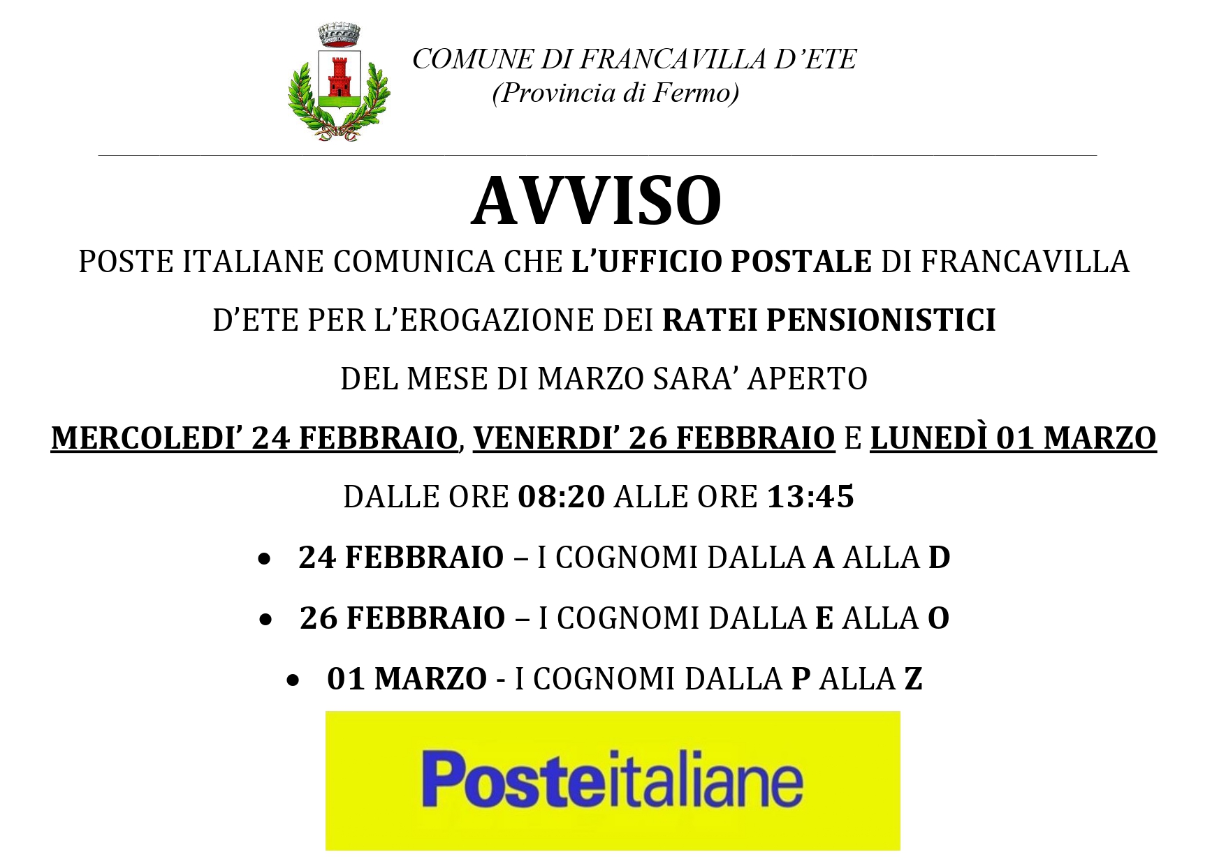 APERTURA UFFICIO POSTALE DI FRANCAVILLA D'ETE - EROGAZIONE RATEI PENSIONISTICI MESE DI MARZO