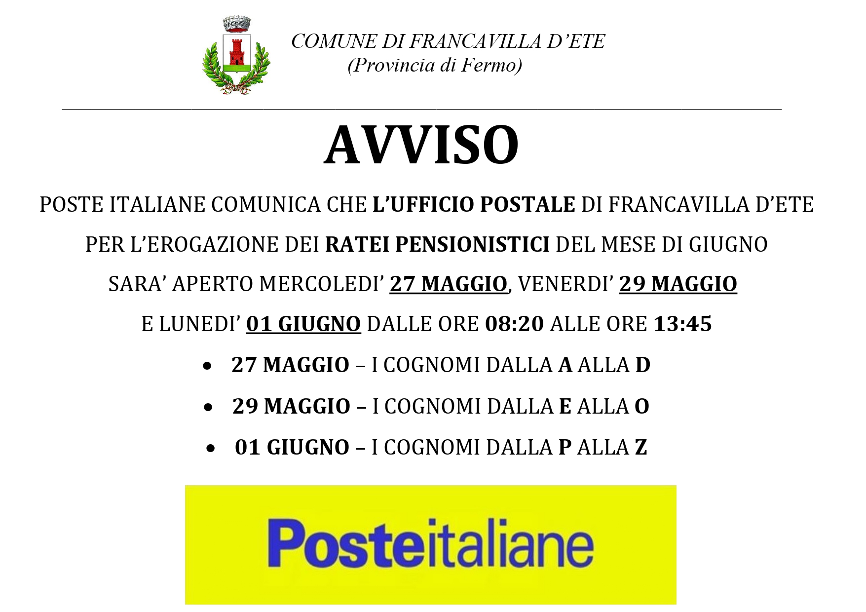 APERTURA UFFICIO POSTALE DI FRANCAVILLA D'ETE - EROGAZIONE RATEI PENSIONISTICI MESE DI GIUGNO