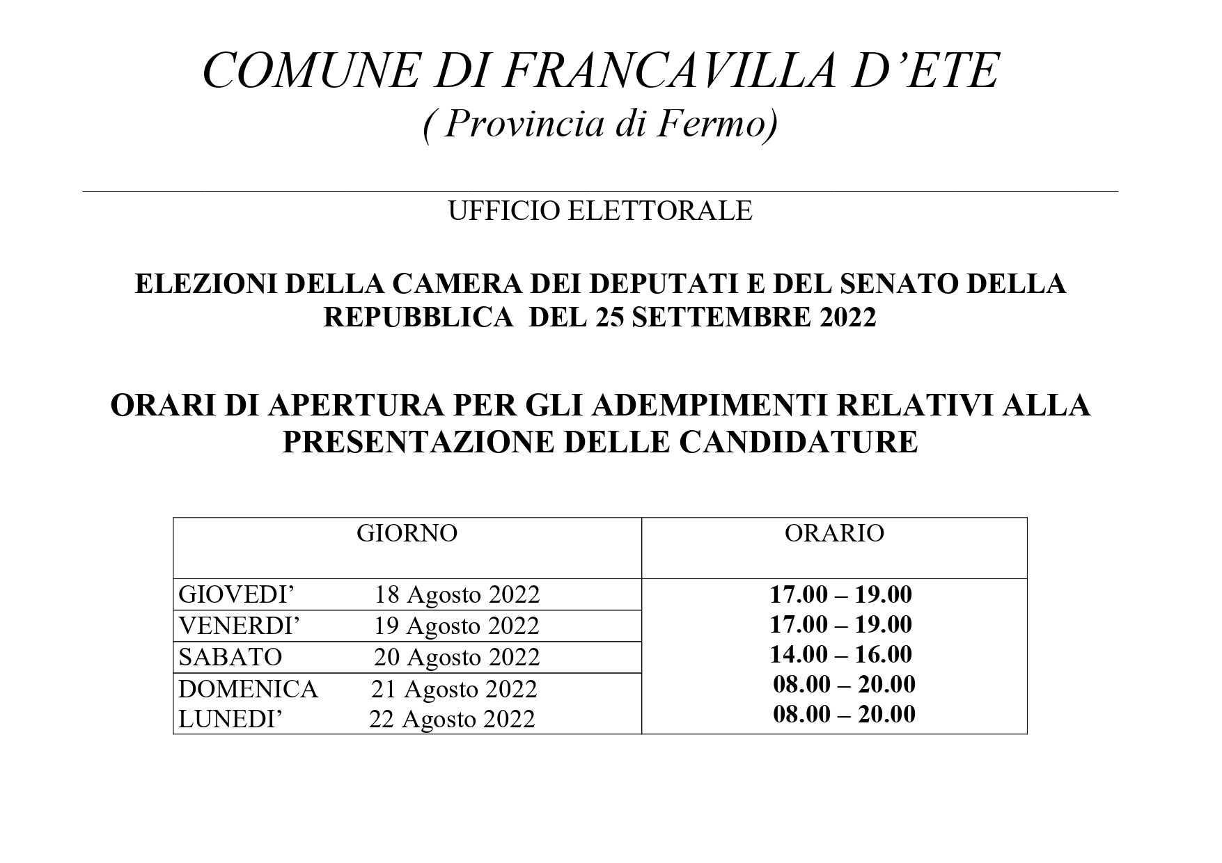 ELEZIONI DELLA CAMERA DEI DEPUTATI E DEL SENATO DELLA REPUBBLICA DEL 25 SETTEMBRE 2022. ORARI DI APERTURA DEGLI UFFICI PER GLI ADEMPIMENTI RELATIVI ALLA PRESENTAZIONE DELLE CANDIDATURE