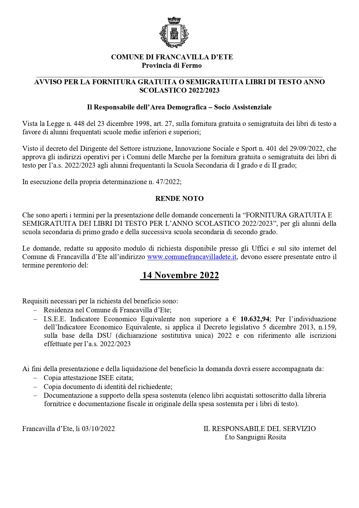 FORNITURA GRATUITA O SEMIGRATUITA DEI LIBRI DI TESTO PER GLI STUDENTI DELLA SCUOLA DELL'OBBLIGO E DELLA SCUOLA SECONDARIA SUPERIORE PER L'A.S. 2022/2023.